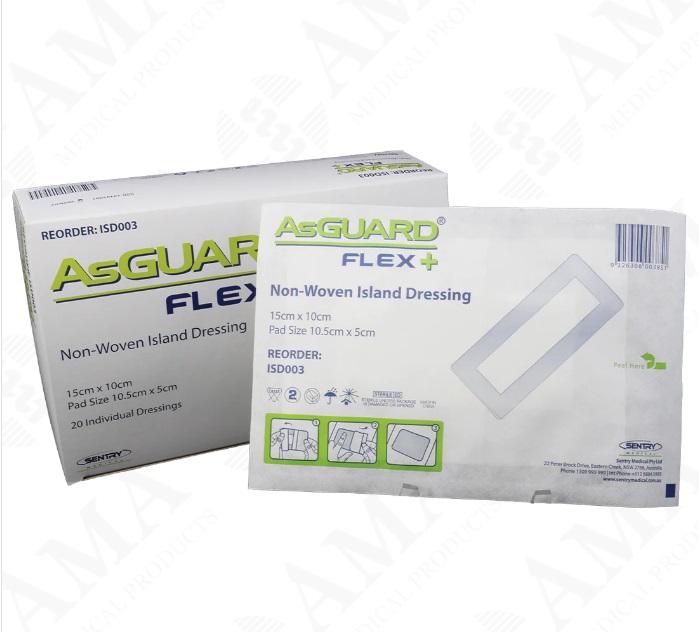 AsGUARD® FLEX + Non-Woven Island Dressings combine an absorbent pad with a soft and comfortable non-woven adhesive backing.