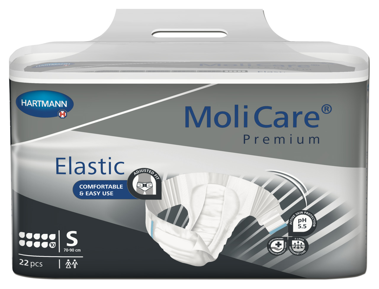 Faster application and less handling helps preserve the dignity of wearers, while the ergonomic design helps reduce stress on the body of care givers. MoliCare Premium Elastic offers maximum leakage protection, absorption performance and odour control for high level confidence and security.