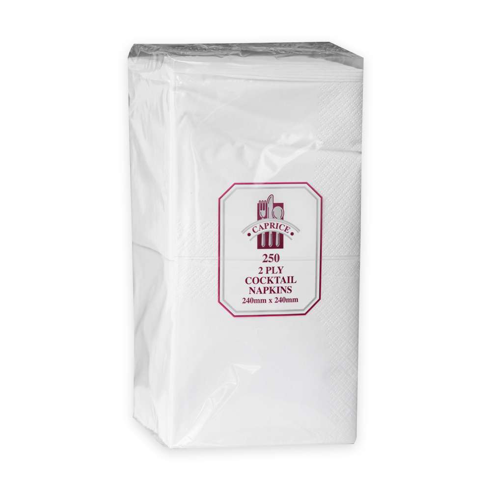 Caprice white, 2 ply cocktail napkins. Measurements: 240mm x 240mm. 2000 per carton