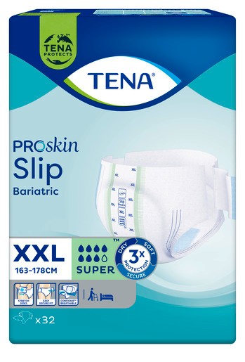 TENA ProSkin Slip Bariatric Super is an extra large open all-in-one incontinence product with re-adjustable fasteners for perfect fit, comfort and leakage protection. Specially designed for overweight or obese people with a larger waist size, between 133-243 cm. TENA ProSkin Slip Bariatric Super have soft textile-like material, a body-close fit and high leakage security and are ideal for someone less mobile or when changing in bed. The fast absorbing core rapidly locks in urine, even in larger quantities, for dryness and the breathable